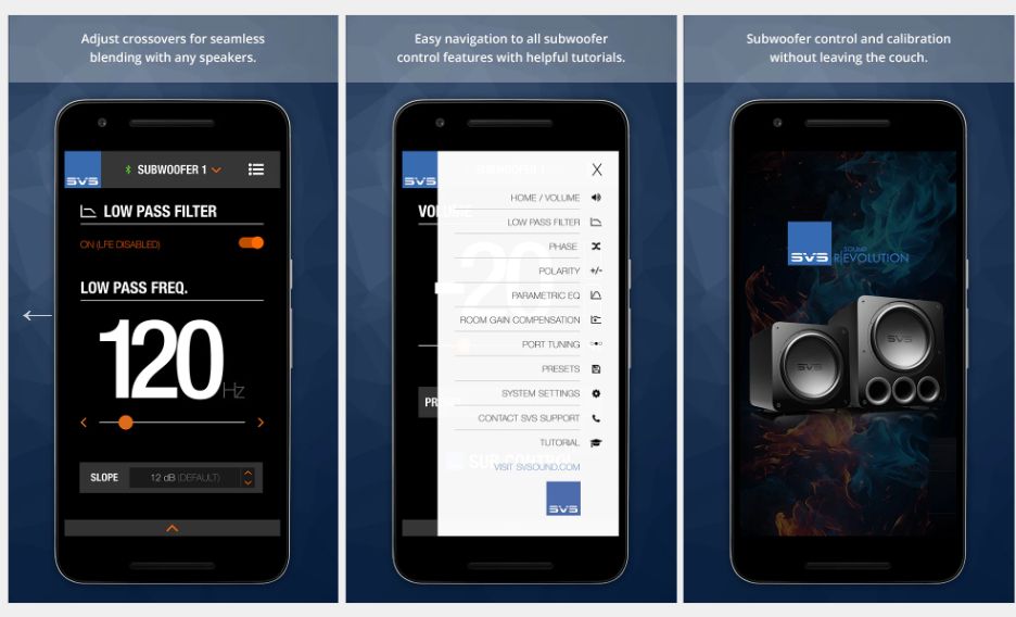 SVS Subwoofer Control-appen. Här får du tillgång till ett av marknadens mest avancerade gränssnitt för subwooferjustering: