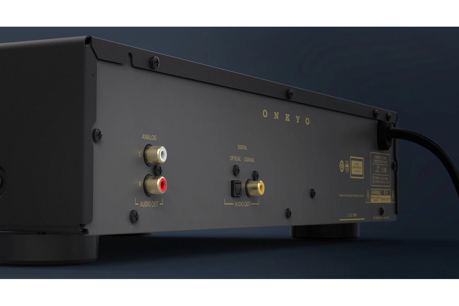 Onkyo har högkvalitativa gudlpläterade RCA-utgångar samt optisk och koaxial digial utgång. På framsidan finns även ett 6.35 mm hörlursuttag med separat volymkontroll.