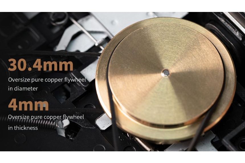 stor kopparbaserad svänghjulskonstruktion. Resultatet är en mycket stabil bandhastighet och