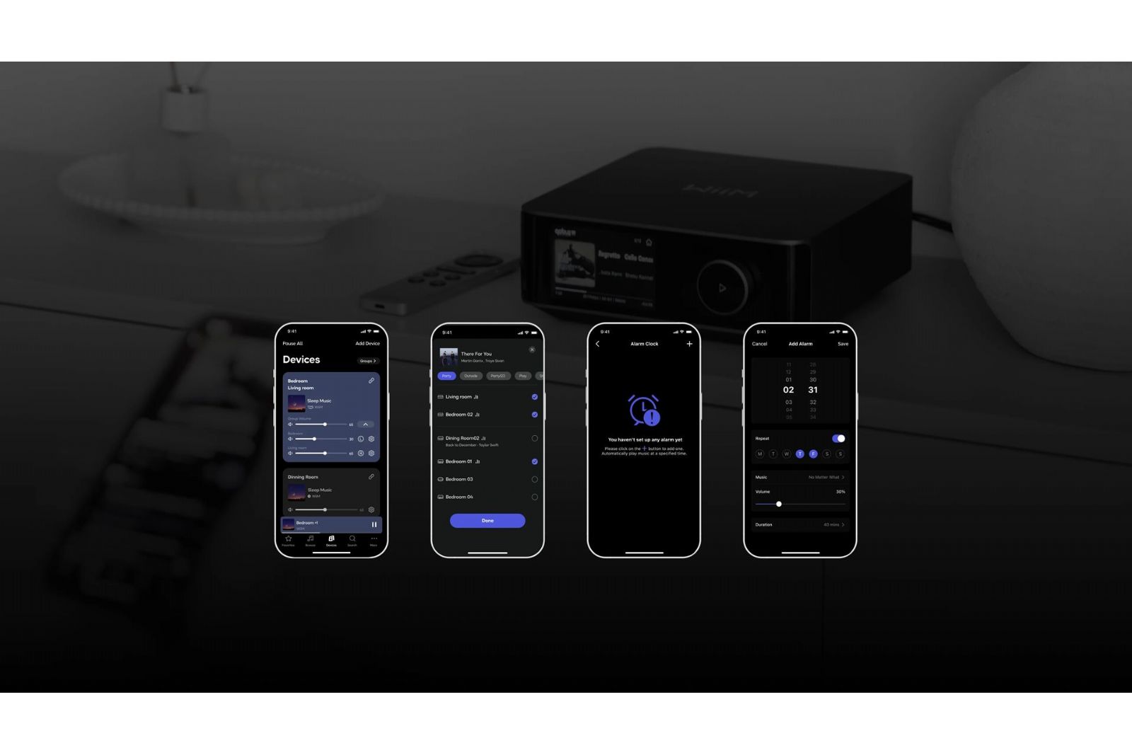 Med WiiM Home-appen får du all kontroll samlad i en enda app. Strömma musik, justera equalizern, gruppera flera rum, ställ in larm eller uppdatera firmware – allt gör du enkelt och smidigt direkt från din telefon eller surfplatta. Förstärkaren går även att styra med den medföljande fjärrkontrollen WiiM Voice Remote 2.