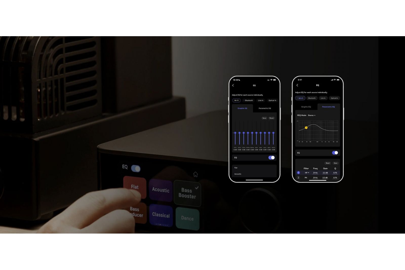 I WiiM Amp Ultra har du väldigt stora möjligheter att finjustera ljudet efter just dina preferenser.- 24 förvalda EQ-inställningar för olika typer av musik