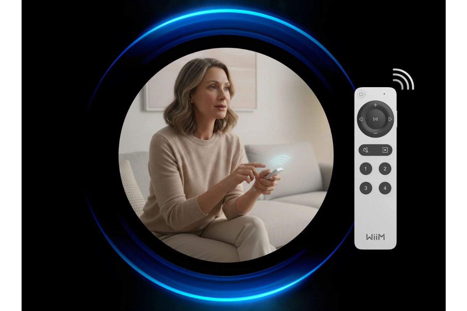 Med WiiM Sound kan du starta, byta låt, justera volym eller söka musik – direkt via högtalarens touchskärm, appen, röststyrning eller medföljande WiiM Voice Remote 2 Lite. Smarta genvägar och röstkommandon ger dig enkel och intuitiv kontroll, oavsett om du står vid högtalaren eller slappnar av i soffan.