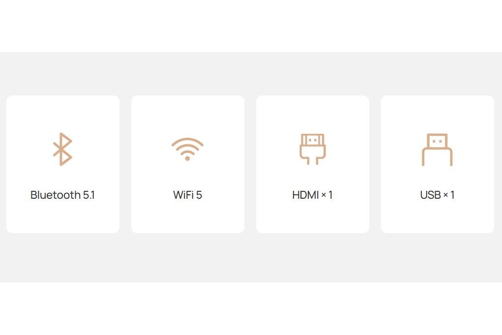 Projektorn har stöd för Wi-Fi 5 dual-band (2,4/5 GHz) för stabil streaming samt Bluetooth 5.1 för anslutning av exempelvis hörlurar eller högtalare. Bland de fysiska anslutningarna finns HDMI med ARC för externa videokällor, USB för uppspelning från lagringsmedia samt DC-ingång för strömförsörjning.
