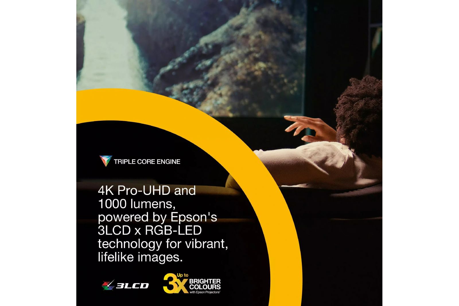 Med 4K PRO-UHD-upplösning och Epsons avancerade bildteknik får du en skarp och detaljrik bild upp till 150 tum. Tack vare Triple Core Engine levereras levande färger, hög kontrast och naturlig ljusstyrka.Med upp till 1000 ANSI lumen och stöd för HDR10 och HLG får du en bild med djup svärta, tydliga detaljer och realistiska färger i både ljusa och mörka scener.