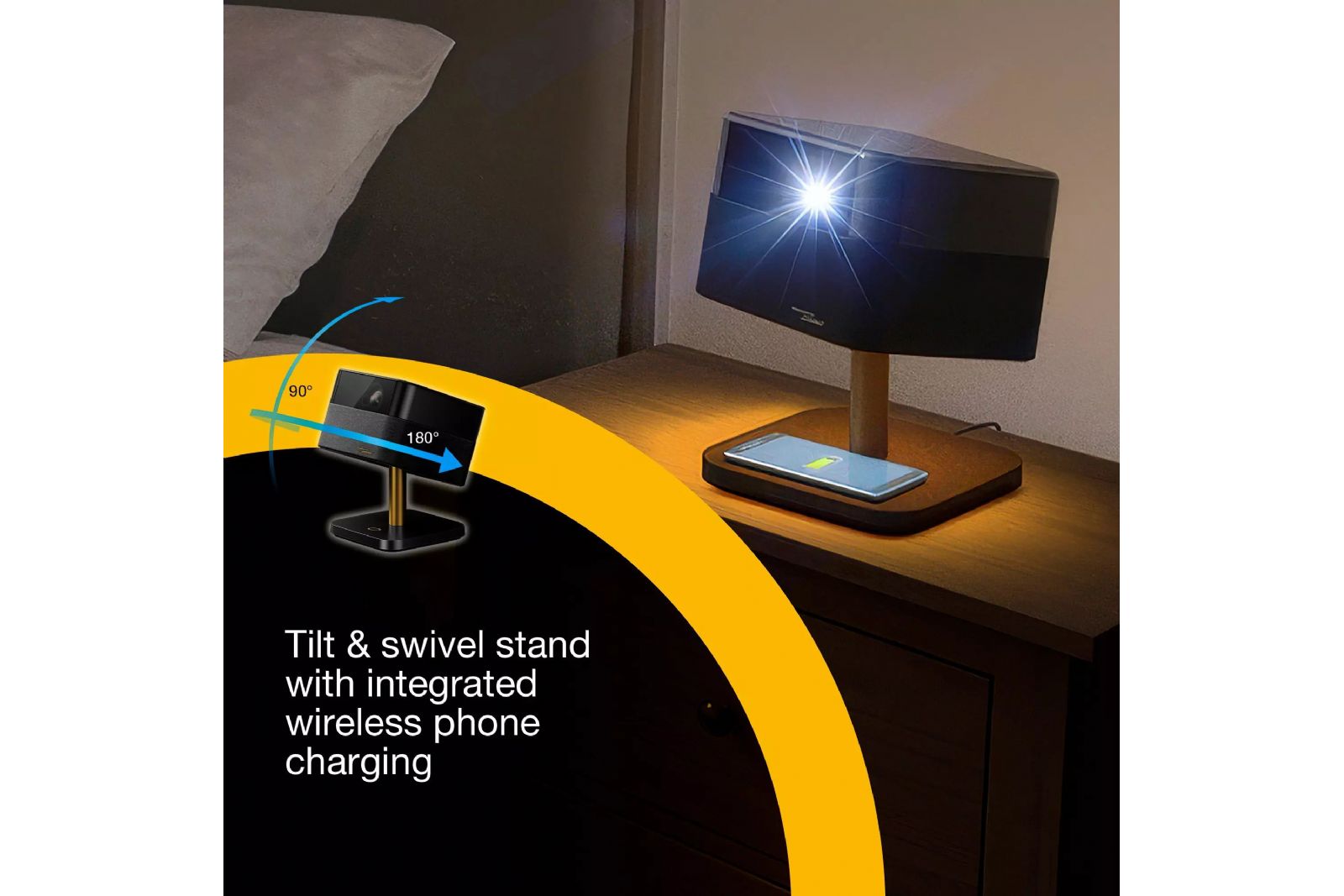 Det integrerade stativet möjliggör 180° rotation och 60° lutning, vilket gör att du kan projicera bilden på vägg, duk eller tak.Dessutom finns trådlös mobilladdning direkt i projektorn, vilket gör den ännu mer praktisk i vardagen.
