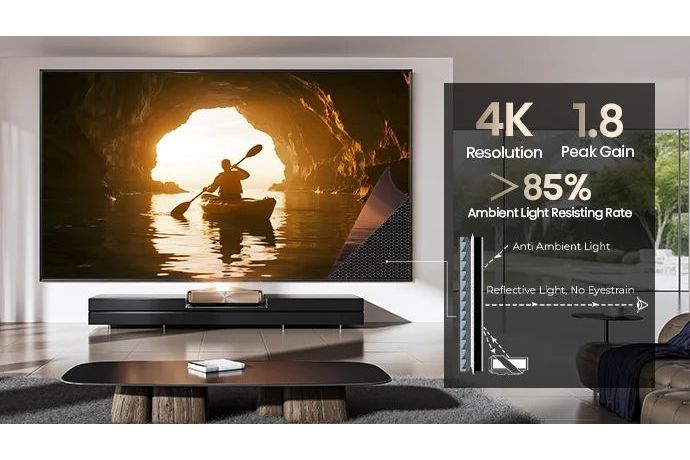 En perfekt anpassad skärm med Ambient Light Rejection (ALR) innebär att du inte behöver mörklägga rummet för att få en imponerande bild. Hisense Laser TV använder anti-reflexteknik som effektivt motverkar störande ljus, vilket ger en skarp och färgstark storbildsupplevelse oavsett var i hemmet du tittar.