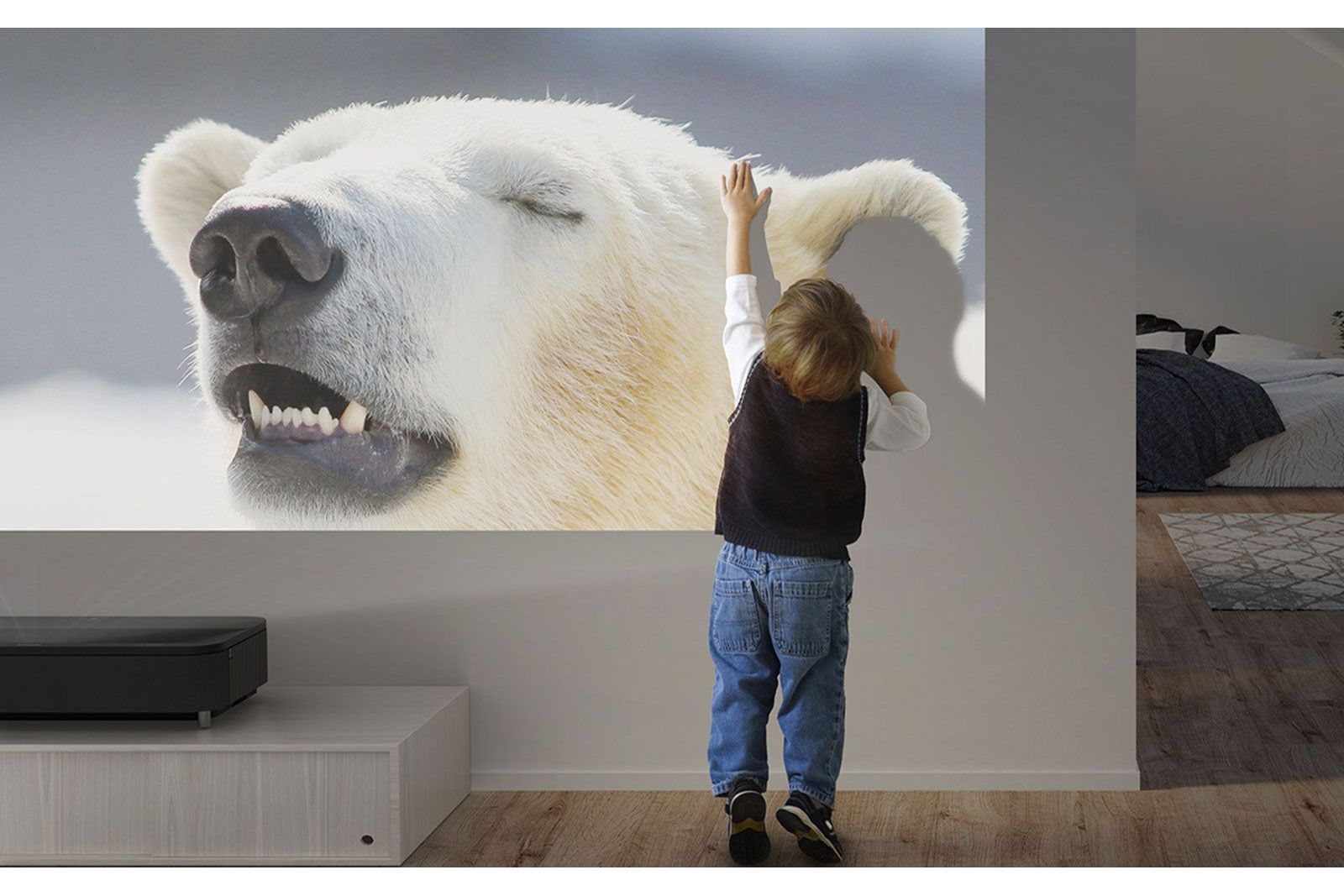 Tack vare det ultrakorta kastavståndet kan projektorn placeras mycket nära väggen och ändå leverera en imponerande bild på upp till 150 tum. Med ett projektionsförhållande på 0,16–0,40:1 krävs endast cirka 30–50 cm avstånd för att skapa en fullskalig bioupplevelse.Det gör installationen både enkel och flexibel, samtidigt som du slipper takmontering och långa kablar.