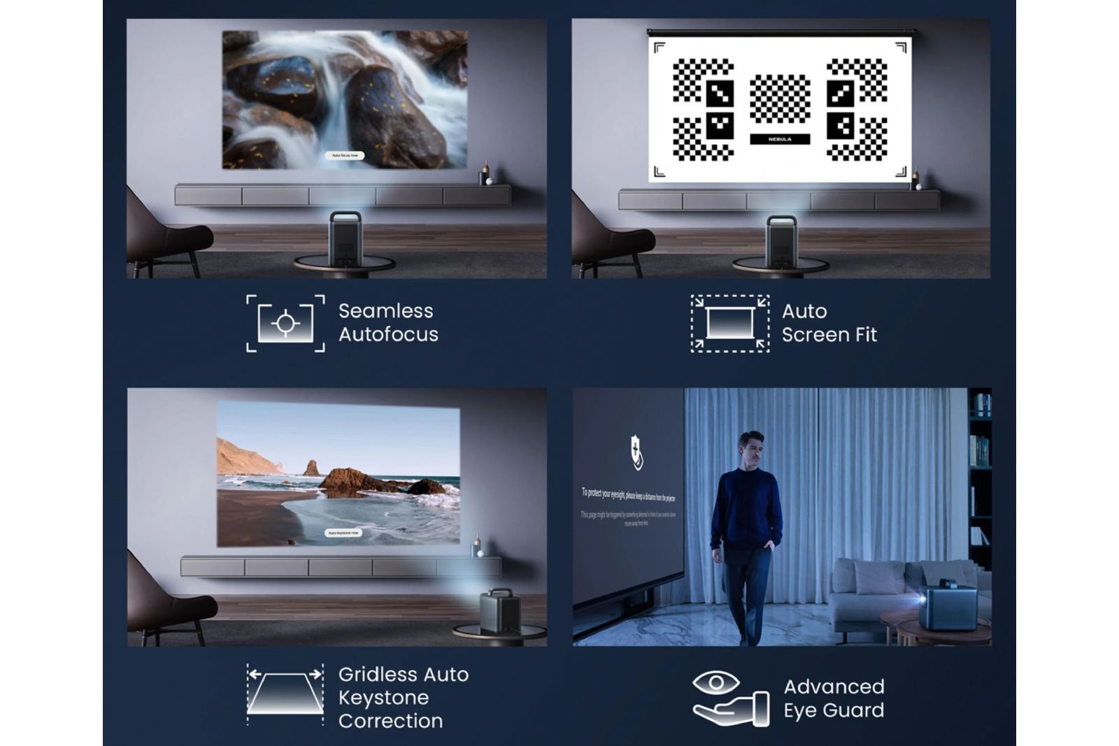 Nebula Cosmos Laser 4K levererar 4K-upplösning och kraftfull laserprojektion med 2.200 ANSI lumen, vilket ger skarpa detaljer och färger som poppar – även i rum med visst ljusinsläpp. Med Intelligent Environment Adaptation (IEA) optimerar projektorn bilden automatiskt efter omgivningen och undviker hinder helt på egen hand.