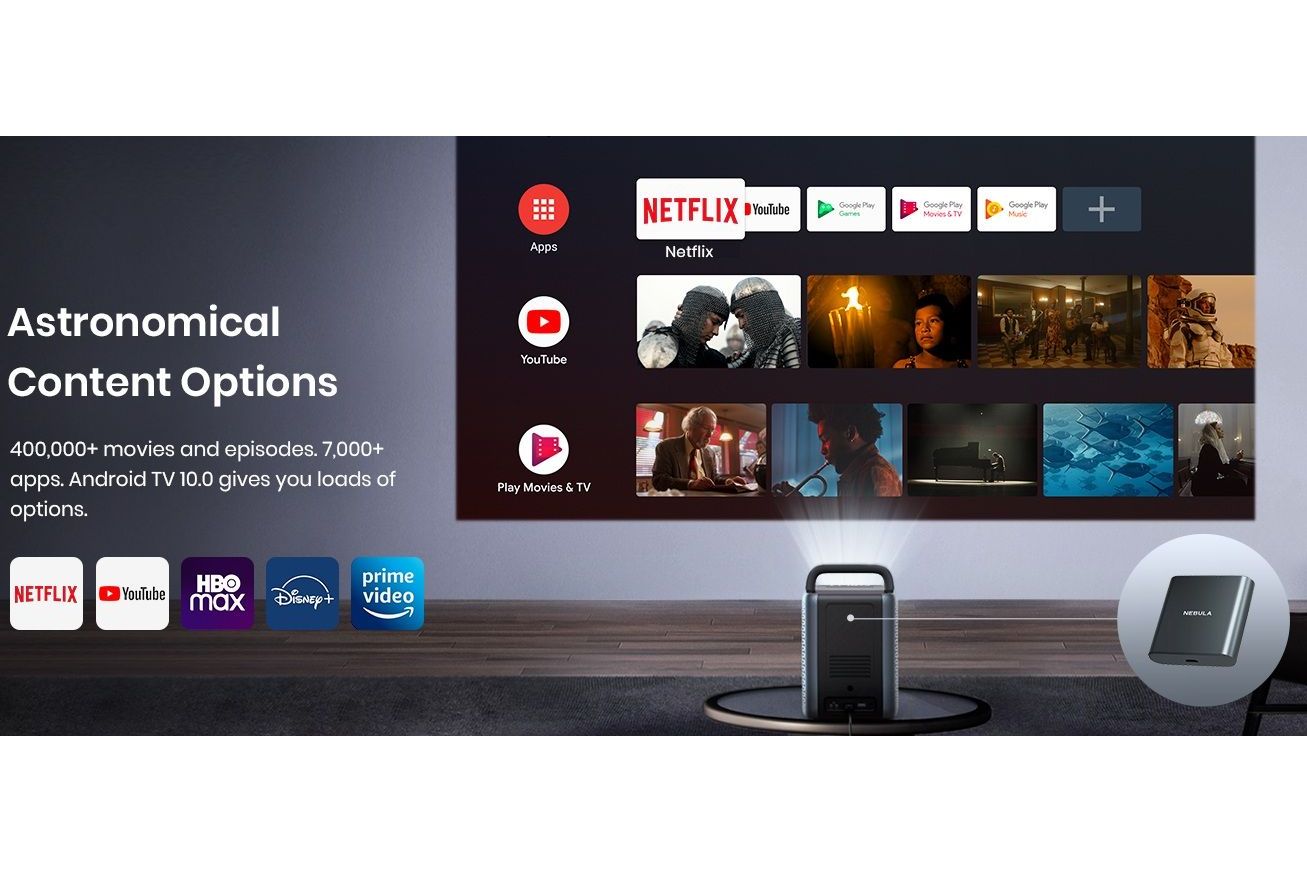 Det ergonomiska bärhandtaget gör det enkelt att ta med Nebula Cosmos Laser 4K dit du vill. Vardagsrum, sovrum eller ute i trädgården – du bestämmer var nästa visning sker. Observera att projektorn inte har inbyggt batteri utan måste kopplas till ett strömuttag.