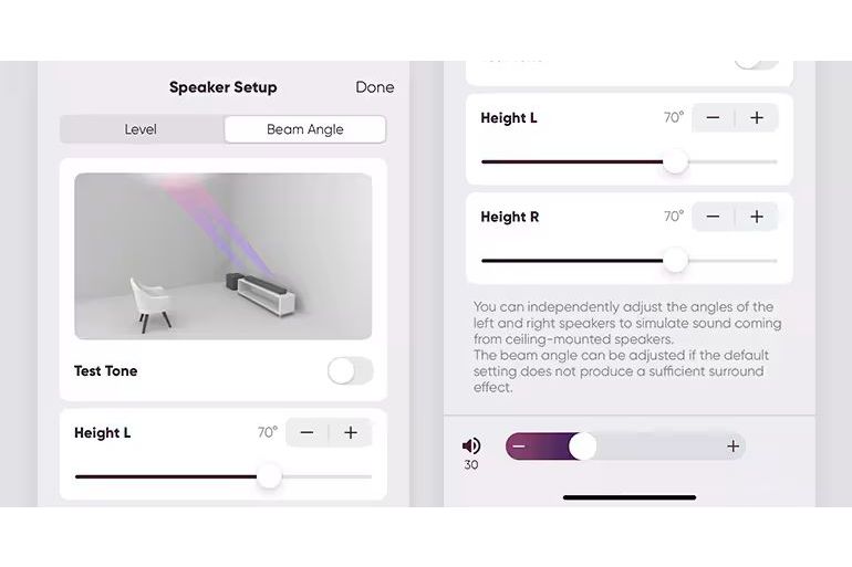 Vinklar och ljudnivåer för höjdhögtalarna kan enkelt justeras med hjälp av den dedikerade MusicCast-appen, som också ger grundläggande kontroll över soundbaren.