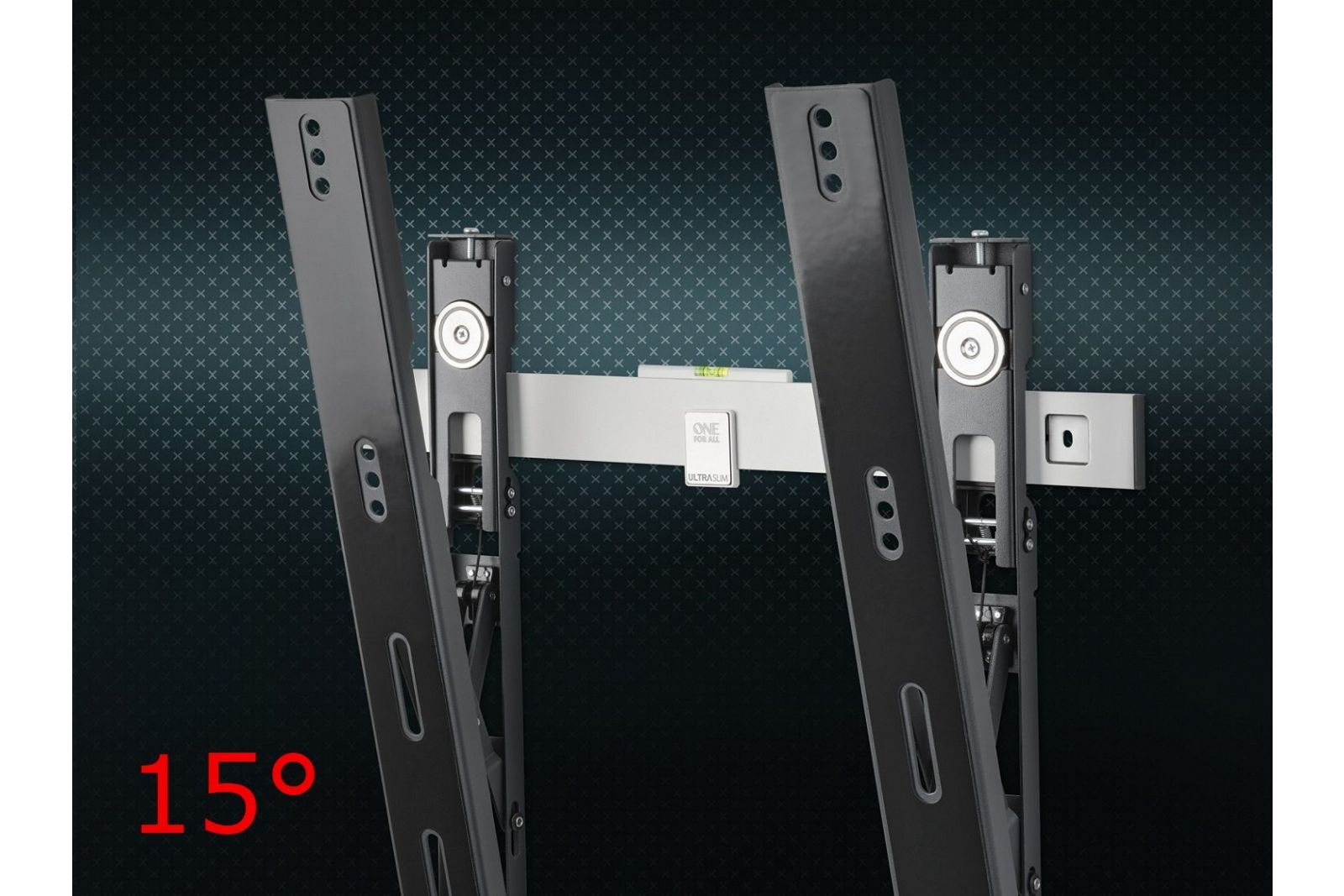 Fästet har en tiltfunktion upp till 15 grader som gör det möjligt att justera vinkeln för att minska reflexer från ljusinsläpp eller lampor. Det förbättrar både kontrast och komfort vid tittande.Den optimerade tiltmekanismen är anpassad för större TV-apparater och har en magnetisk tilt-låsning som håller skärmen i önskat läge utan att den rör sig oavsiktligt.