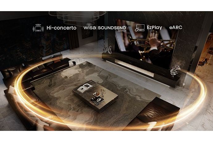 Få hemmabion att fungera i perfekt harmoni. Med EzPlay och Hi-Concerto kan din Hisense-TV synkas med kompatibla soundbars*, medan WiSA SoundSend och eARC möjliggör trådlös anslutning utan kabeltrassel. Njut av stort, fylligt ljud med enkel styrning – smidigt och problemfritt.