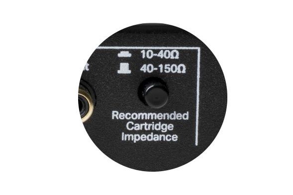 På baksidan finns en knapp för impedansinställning, med två olika lägen (10–40 ohm och 40–150 ohm), vilket gör det enkelt att anpassa transformatorn efter din MC-pickup för optimal ljudkvalitet.