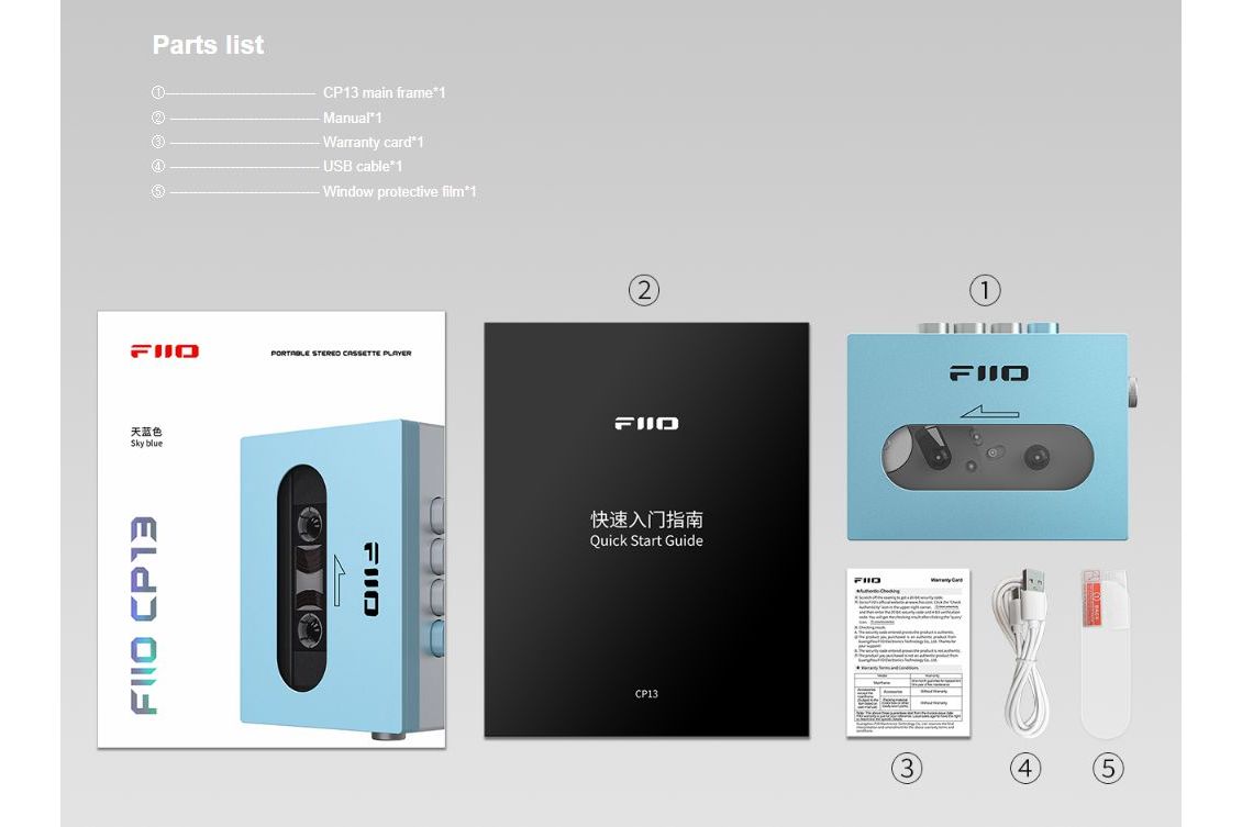 FiiO CP13 portabel kassettbandspelare, USB-kabel, skyddsfilm för fönster, användarmanual
