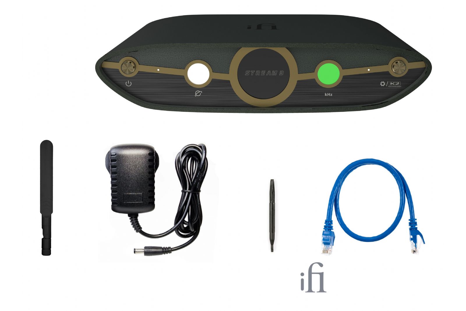 Med i förpackningen följer iFi audio ZEN Stream 3, en RJ45 Ethernet-kabel, Wi-Fi-antenn, nätadapter, verktyg för justering av switch-inställningar samt en snabbstartsguide.