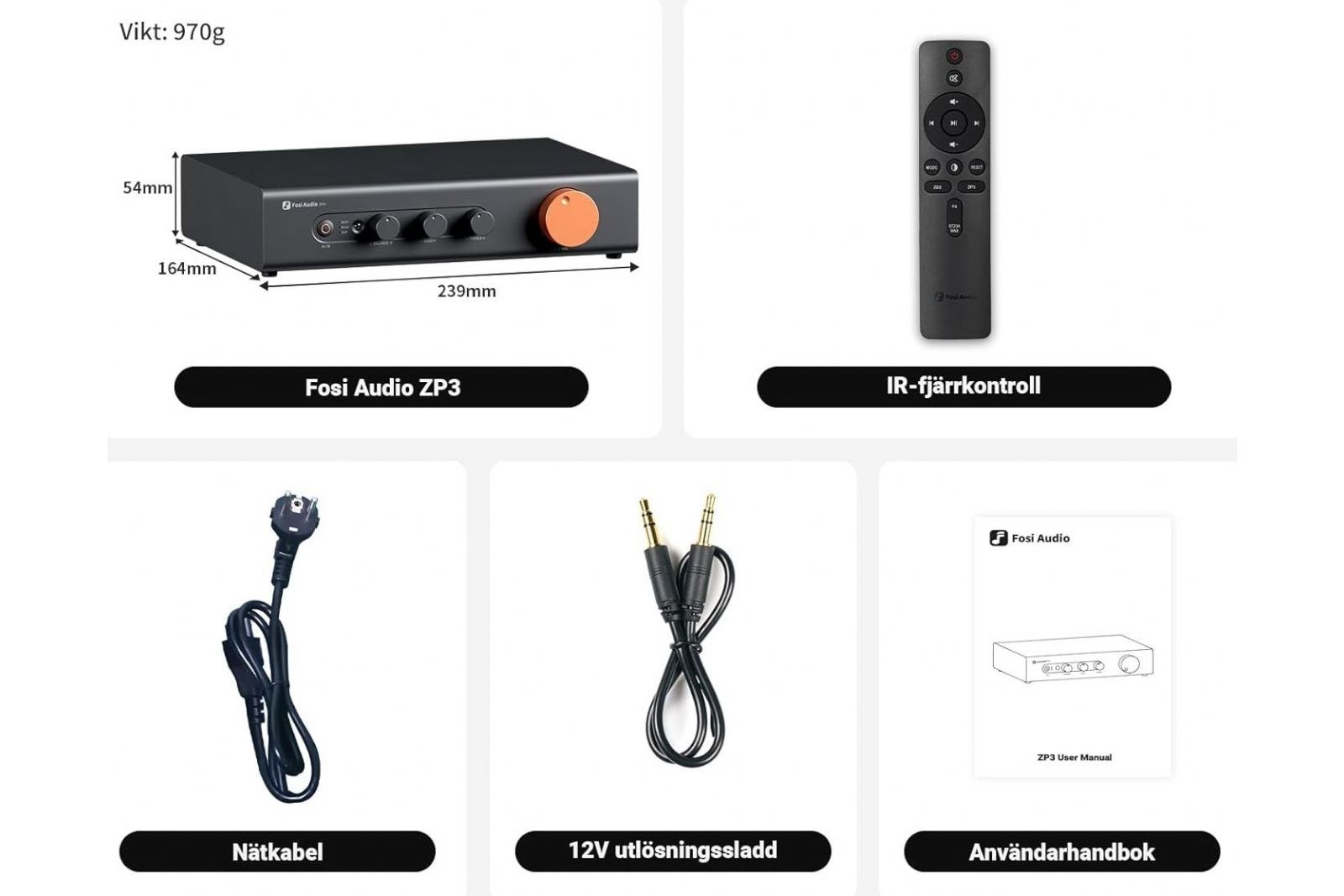 Styrningen är enkel. Med den medföljande fjärrkontrollen växlar du snabbt mellan ingångar och justerar volymen utan att behöva resa dig ur soffan. För dig som vill ha ett mer automatiserat system finns även 12V trigger in/ut, vilket gör det möjligt att starta ZP3 i takt med annan utrustning, som t.ex. slutsteg från Fosi Audio.