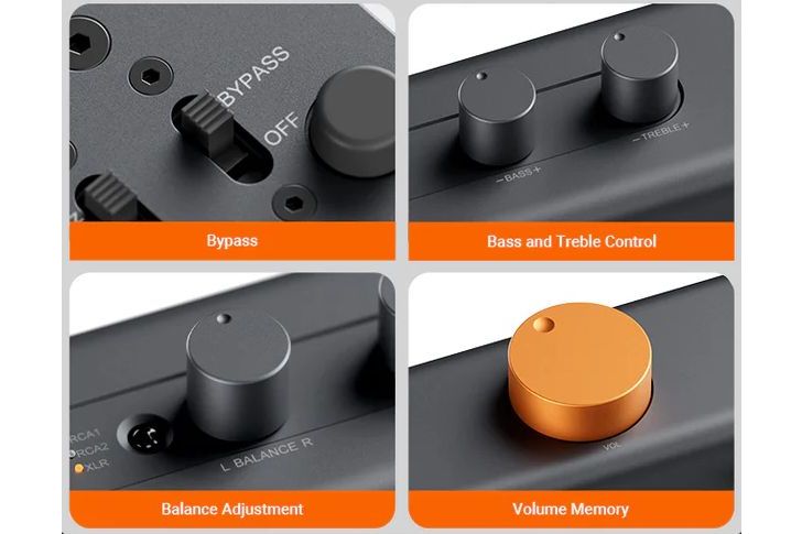 Du har även möjlighet att finjustera ljudbilden tack vare inbyggd ton- och balanskontroll. Dessa kan aktiveras eller stängas av med ett enkelt knapptryck (bypass), och inställningarna sparas individuellt för varje ingång – något som annars är ovanligt i den här prisklassen.