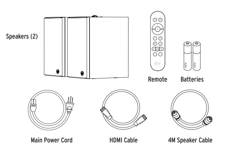 I förpackningen ingår strömkabel (2 meter), fjärrkontroll med batterier, 4 meter högtalarkabel samt 1.5 meters HDMI-kabel.