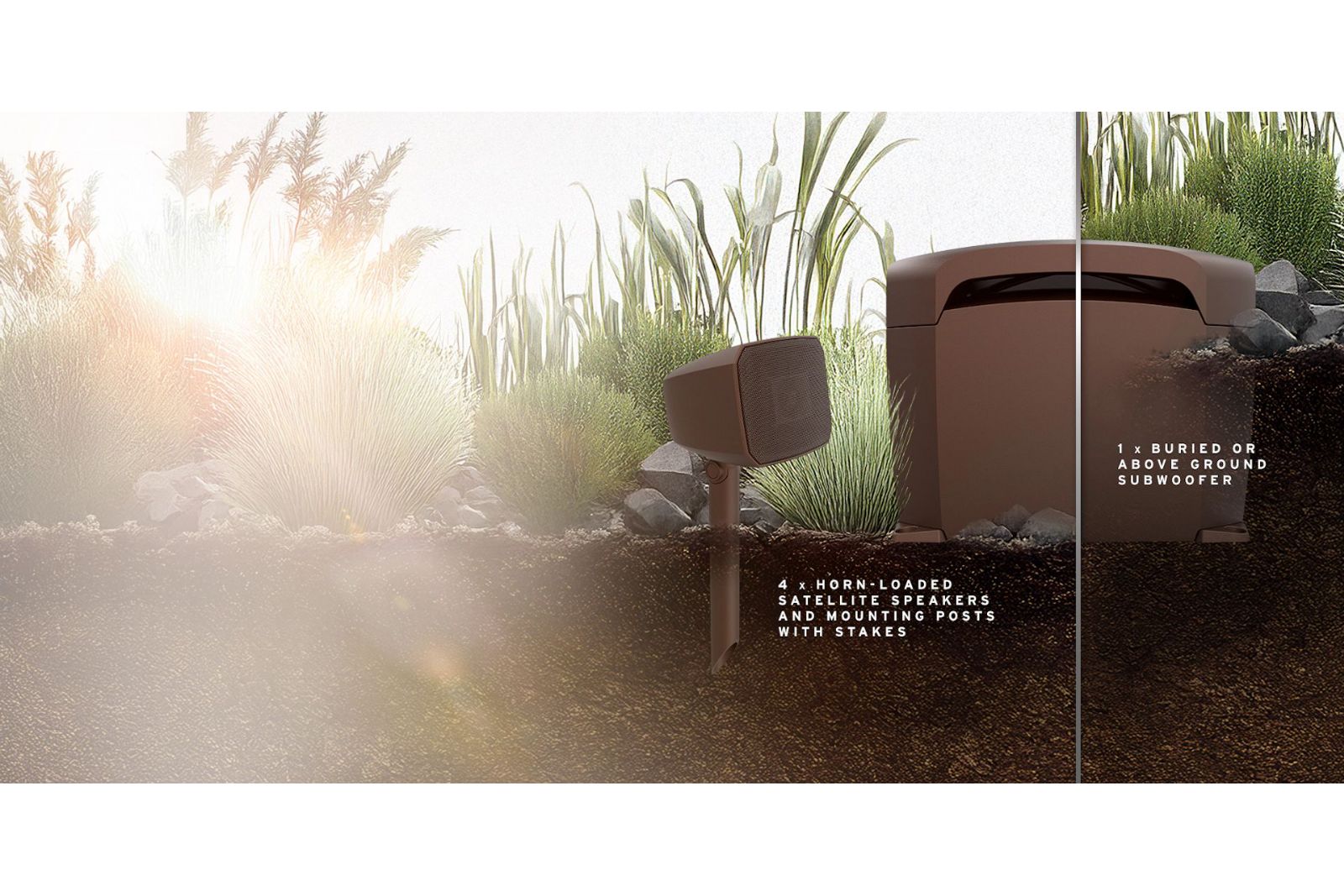 Systemet använder en sluten konstruktion för bättre driftsäkerhet utomhus, samtidigt som subwoofern är anpassad för sten och markmiljöer eller delvis nedgrävning, vilket gör den enkel att integrera diskret i trädgårdsmiljön.