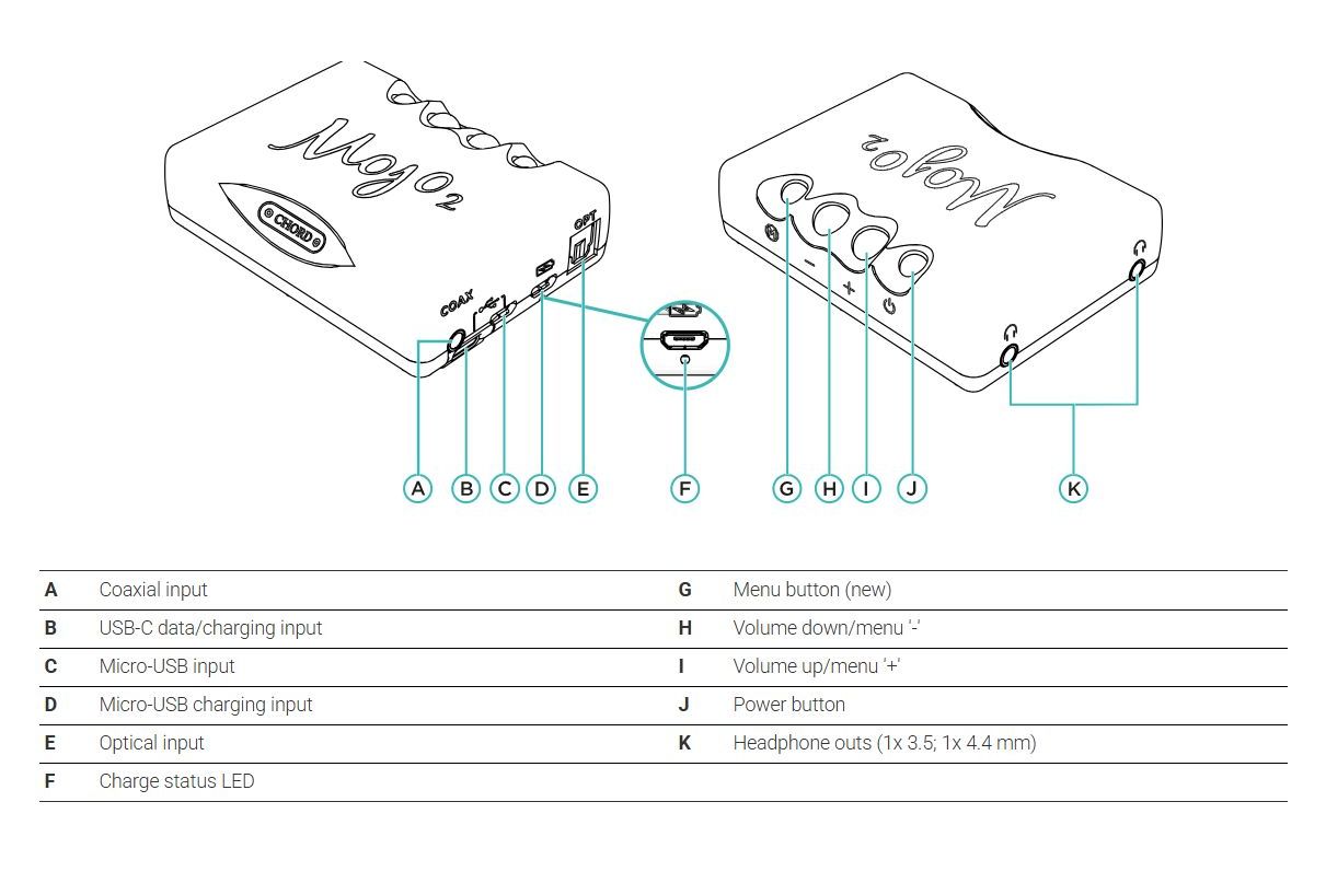 Mojo 2 är bestyckad med en optisk och en koaxial digital ingång, USB-C (dataöverföring/laddning), dubbla micro-USB (en för dataöverföring, en för laddning). Då hörlursförstärkaren inte har någon display så ställer man in källa, samplingfrekvens och volym med de färgade knapparna på fronten. Mojo 2 klarar allt från mindre in-ear lurar till riktigt krävande hifi-hörlurar vilket gör den väldigt allround.Det finns även dubbla hörlursuttag, ett balanserat (4.4 mm) och ett obalanserat (3.5 mm)