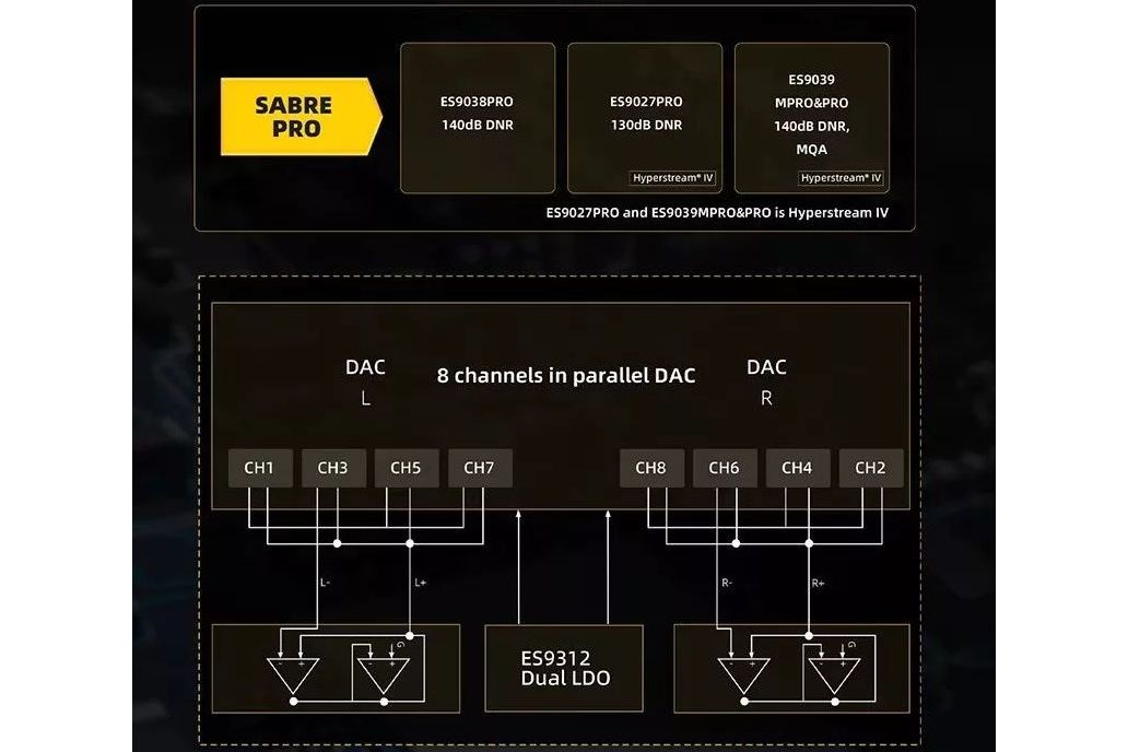 I hjärtat sitter flaggskepps-DAC:en ESS ES9027PRO med en fullt differentiell 8-kanalig konstruktion. Resultatet är extremt låg distortion, hög kanalseparation och en precision som normalt hör hemma i stationära high-end-lösningar – perfekt för både kritisk musiklyssning och professionellt bruk.