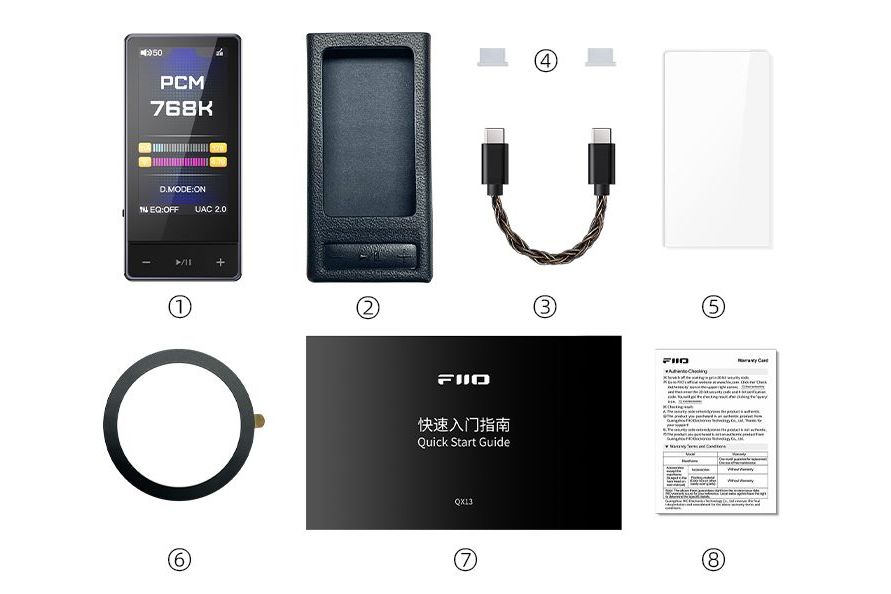 I förpackningen ingår QX13 (1), läderfodral (2), USB-C till USB-C kabel (3), Typ-C silikonpluggar (4), skyddsfilm till skärmen (5), cirkelformad magnet (6), snabbstartguide (7) och garantikort (8).