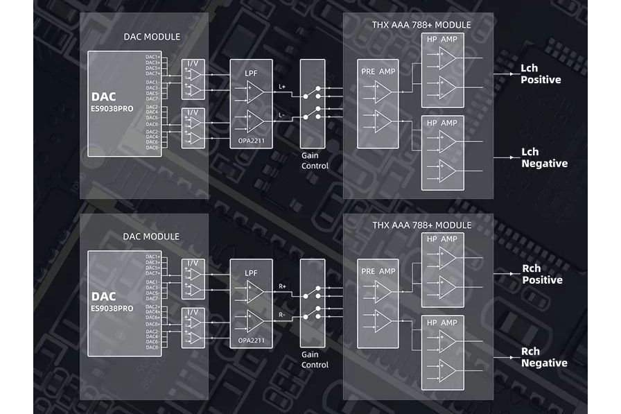 För den analoga förstärkningen används en åttakanalig THX-788+, framtagen i nära samarbete mellan THX och FiiO. Förstärkningen kan justeras i fem gain-lägen och volymen i hela 120 steg per nivå. Vid högsta gain levererar R9 upp till 7300 mW per kanal, vilket räcker för allt från mycket lättdrivna hörlurar till extremt krävande modeller – och till och med mindre passiva högtalare.