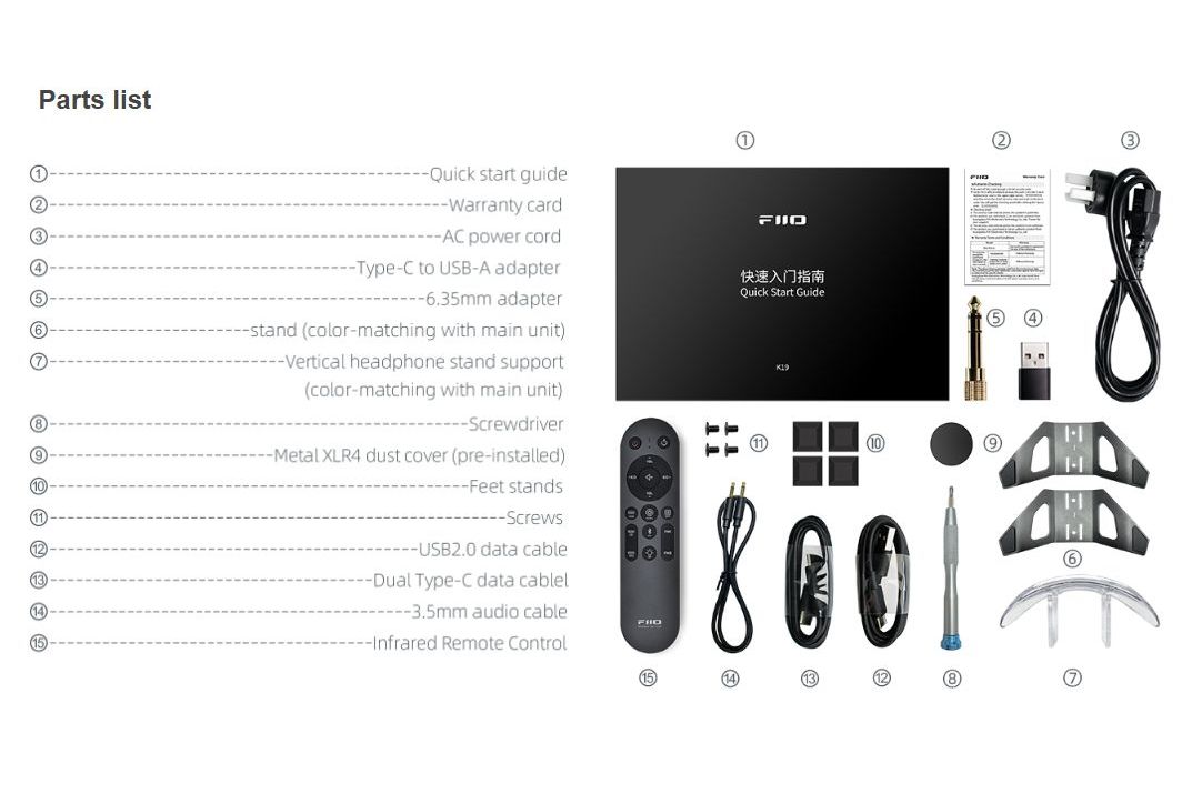 I kartongen med FiiO K19 medföljer förstärkaren, IR-fjärrkontroll, nätkabel, hörlursadapter (6,35 till 3,5 mm), USB-A till USB-C-kabel, USB-C till USB-C-kabel, USB-adapter, gummifötter, vertikalställ, skruvar, skruvmejsel, hörlurshållare, XLR4-dammskydd samt analoga kablar och dokumentation.