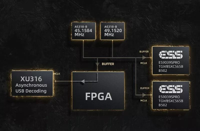 Två Accusilicon AS318-B femtosekund-oscillatorer (45,1584 och 49,1520 MHz) ansvarar för extremt exakt timing. Tillsammans med K19:s globala klockhantering reduceras fasbrus och jitter kraftigt, vilket ger renare transienter, bättre fokus och stabil ljudbild – oavsett samplingsfrekvens.