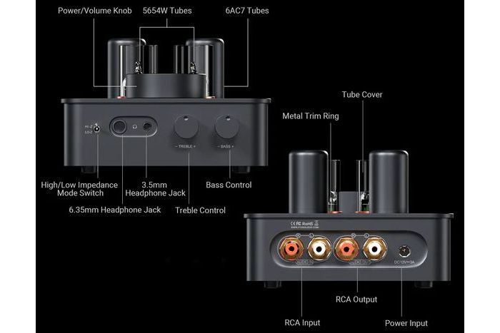 Stödet för 16 – 300 ohm via det valbara impedansläget gör den mångsidig nog för de flesta hörlurar. På fronten finns 6.35 mm och 3.5 mm hörlursuttag, och på baksidan stereo RCA in/ut för smidig integrering med hifi-system.