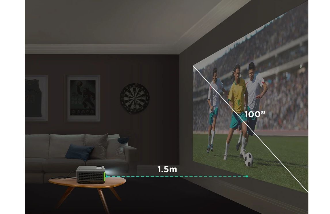 Upplev en 100-tums bild från endast 1.5 meters avstånd tack vare kortkastförhållandet 0.69–0.83. Den optiska zoomen på 1.2 gånger ger extra flexibilitet och gör det enkelt att anpassa projektorn till alla hemmiljöer.