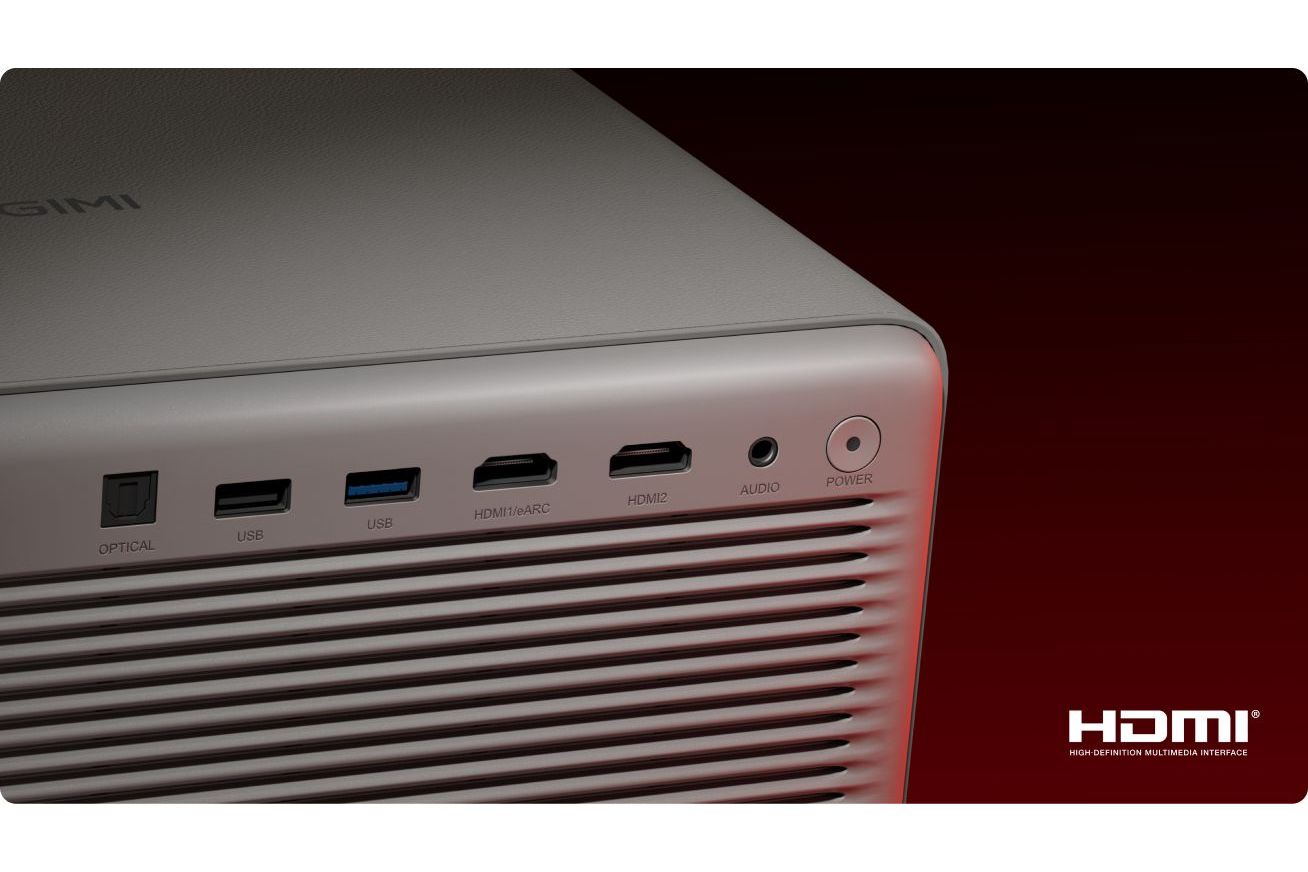XGIMI Horizon 20 Max erbjuder flera anslutningsmöjligheter som gör det enkelt att koppla in spelkonsoler, mediaspelare och andra externa enheter. Projektorn är utrustad med två HDMI-ingångar där HDMI 1 har stöd för eARC, vilket gör att högkvalitativt ljud kan skickas vidare till en kompatibel soundbar eller hemmabioreceiver.För lagring eller uppspelning från externa enheter finns även USB 3.0 och USB 2.0, medan optisk digital ljudutgång och 3,5 mm ljudutgång gör det möjligt att ansluta externa ljudsystem.