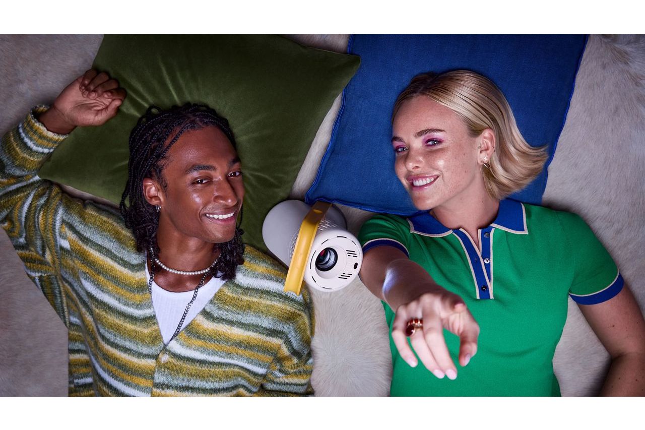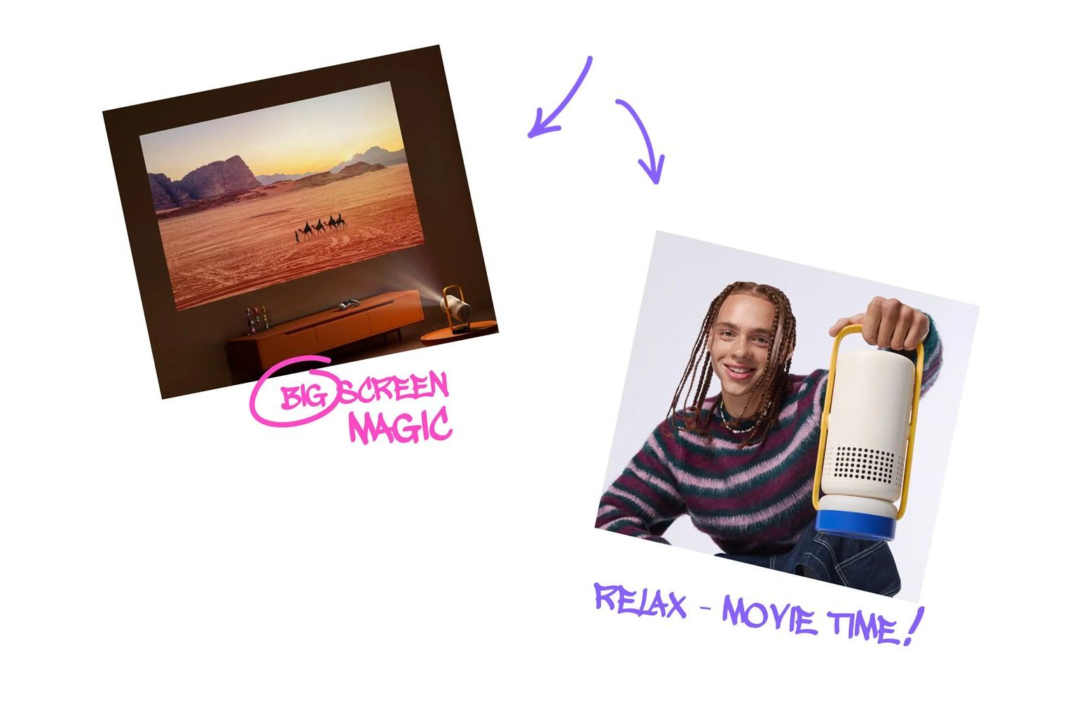 Vibe One är designad för att vara lika snygg som funktionell. Den moderna formen gör projektorn till en naturlig del av inredningen. För den som vill sätta en personlig prägel ingår även dekorativa klistermärken i förpackningen så att projektorn kan anpassas efter egen stil.Den integrerade stativkonstruktionen fungerar dessutom som ett praktiskt bärhandtag, vilket gör projektorn enkel att ta med mellan olika rum eller utomhus.