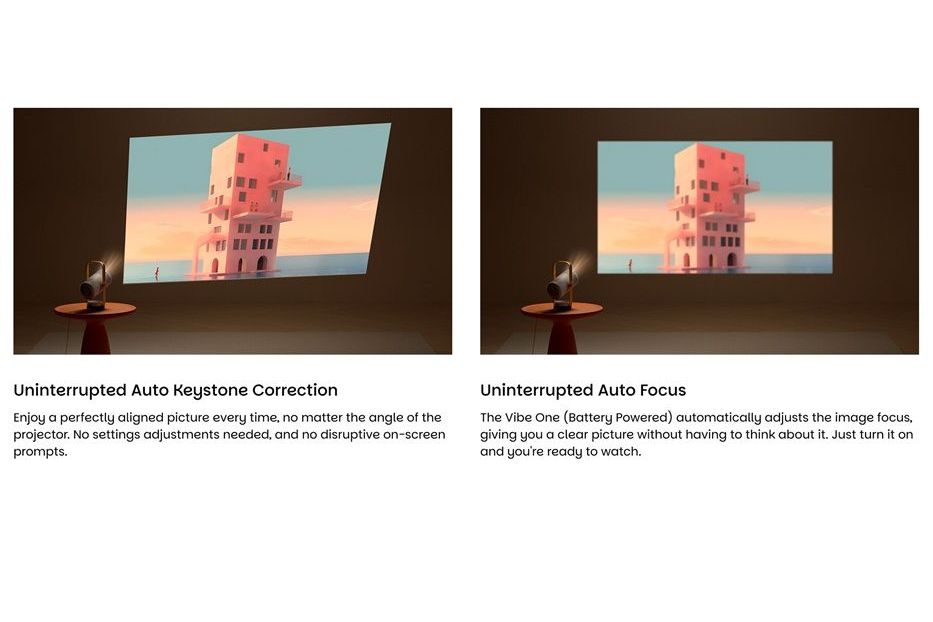 Vibe One justerar automatiskt bilden med hjälp av Auto Keystone Correction och Auto Focus. Projektorn anpassar bilden så att den alltid blir rak och skarp utan att du behöver göra några manuella inställningar.Det gör installationen snabb och enkel – starta projektorn och börja titta direkt.