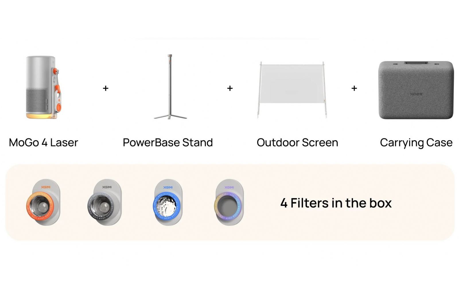 I förpackningen med MoGo 4 Laser Outdoor Collection ingår projektor, PowerBase-stativ, portabel utomhusduk med stativ, magnetiska ljusfilter, transportväska, fjärrkontroll samt strömadapter och kablage.