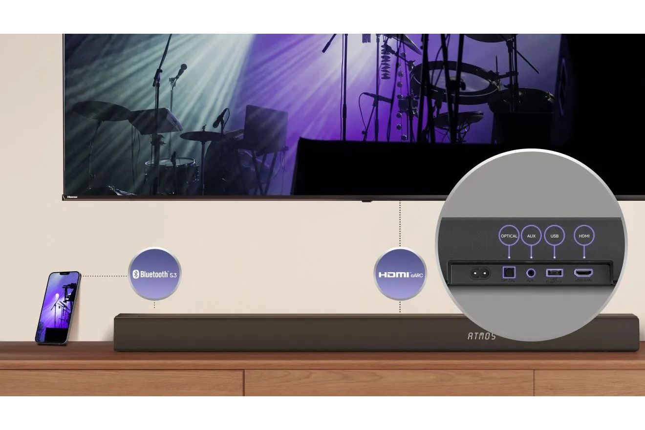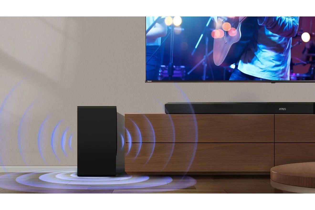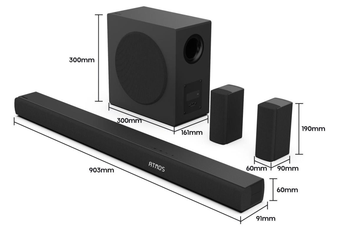 Med Hisense AX5140Q 5.1.4 Dolby Atmos soundbar får du:+ 5.1.4-kanals soundbar med fler element