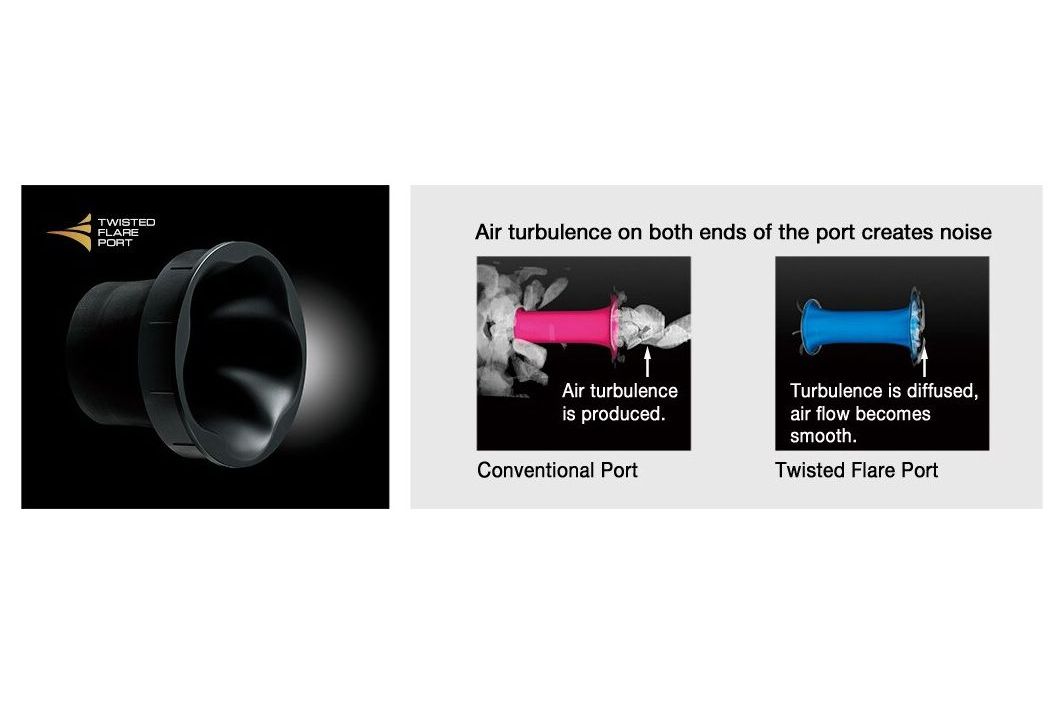 Den unika Twisted Flare Port-designen minskar turbulens i luftflödet och reducerar oönskat brus. Resultatet är en renare, tajtare och mer naturlig bas, oavsett om du tittar på film eller lyssnar på musik.