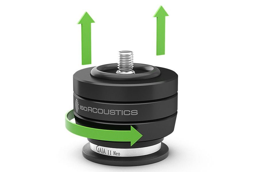 GAIA Neo skruvas upp i högtalaren tills den ligger an mot högtalarens botten. För att möjliggöra exakt justering har foten fått en ny höjdmekanism – genom att vrida på fotens nedre del kan höjden finjusteras med hög precision, upp till 8.5 mm mellan ändlägena.
