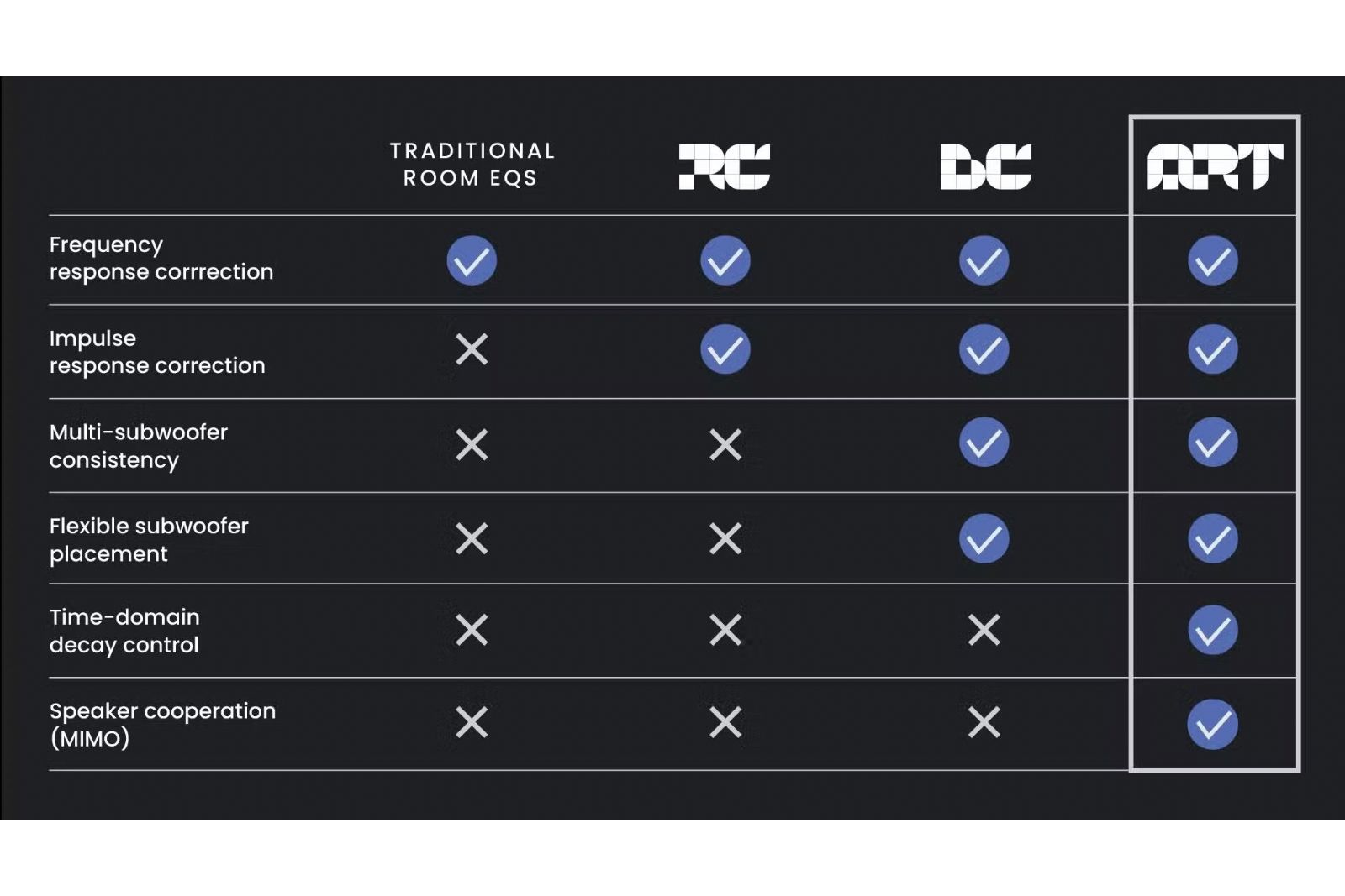 BC fokuserar på subwooferhantering, integration med huvudhögtalare och jämn basåtergivning. ART tar nästa steg och använder alla tillgängliga högtalare för att kontrollera resonanser och avklingningstider, med större precision över rummet.