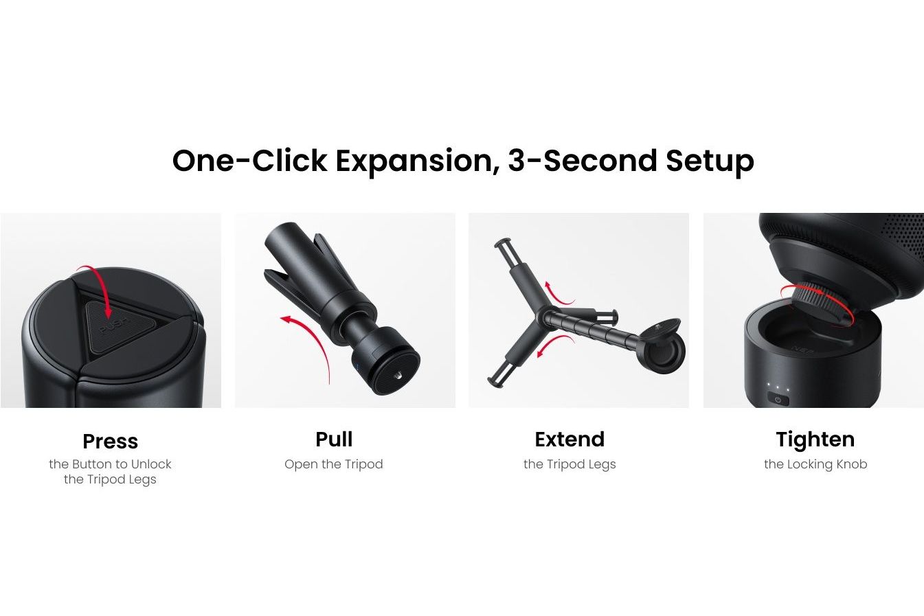 one-click mekanism fälls stativet upp på bara några sekunder, vilket gör installationen både snabb och smidig. Den justerbara höjden från cirka