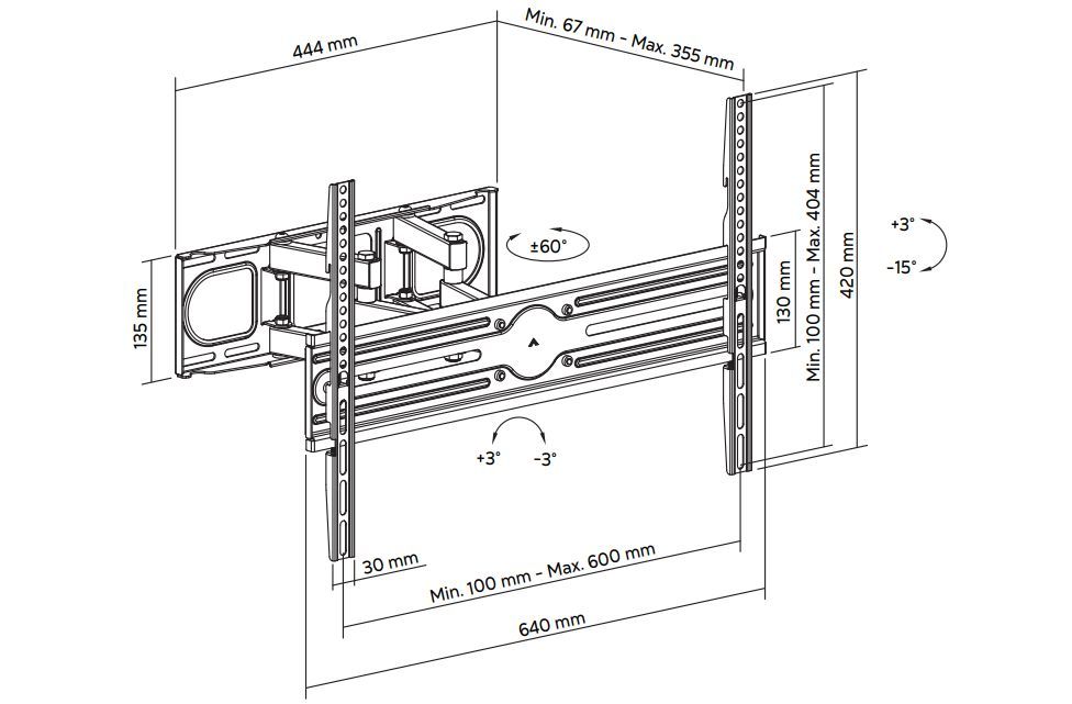 Tack vare de tre lederna på fästet får man en enorm flexibilitet i hur skärmen kan justeras. Det går att svänga 60 grader åt vänster respektive höger samt även tiltas 3 grader uppåt och 15 grader nedåt. I infällt läge bygger det 67 mm cm och med fullt utdragna armar får man ett avstånd på 36 cm mot väggen. Fästet är gjort för skärmar som har en VESA-standard från 100 x 100 till 600 x 400 med en maximal vikt på 40 kg.