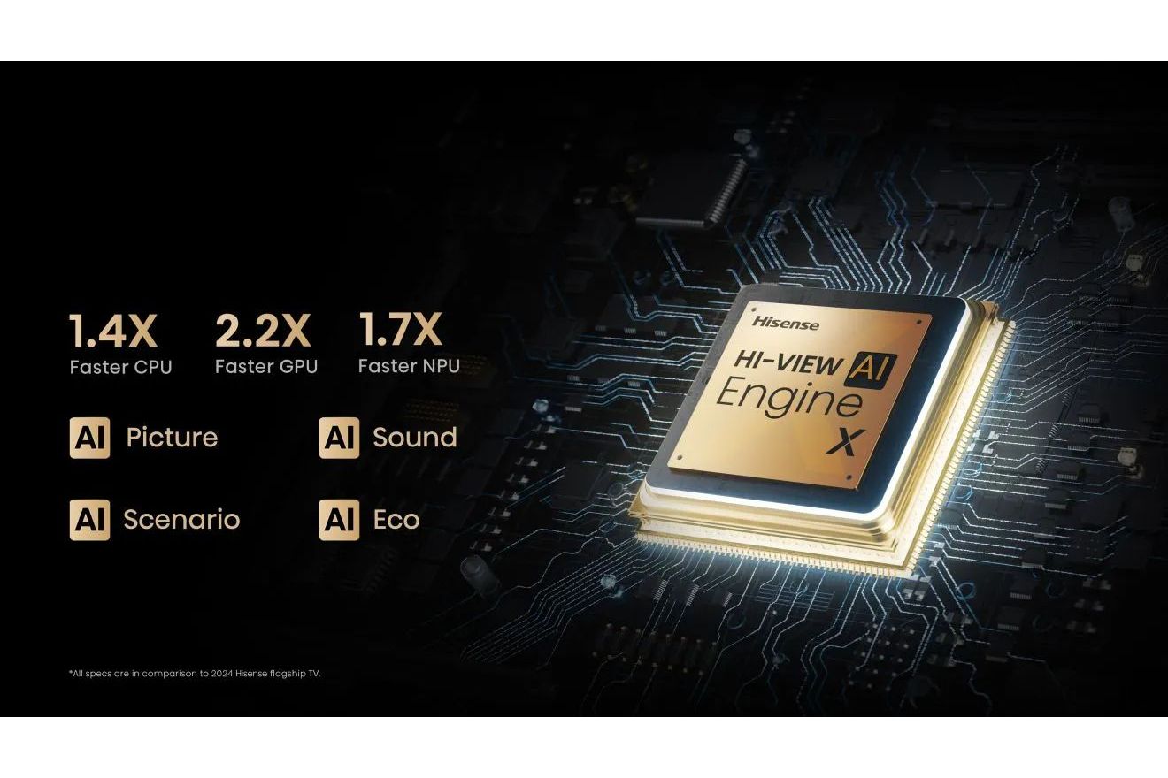 Hi-View AI Engine X är Hisenses mest avancerade AI-processor, som med hjälp av Deep Neural Network kontinuerligt optimerar både bild och ljud för maximal realism. Precis som en mänsklig hjärna lär den sig hela tiden och anpassar prestandan efter vad du tittar på – oavsett om det är sport, animation, spel eller film.Processorn kombinerar flera intelligenta funktioner: AI Picture förbättrar skärpa, färg, kontrast och rörelser för verklighetstrogna scener, AI Sound analyserar dialog och anpassar ljudet efter innehåll och rum, AI Scenario justerar bilden automatiskt utifrån scenen, och AI Eco optimerar energianvändningen genom att styra bakgrundsbelysning och skärm för effektiv drift.