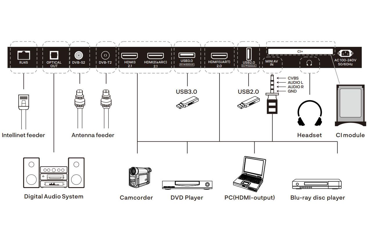 TV:n erbjuder ett brett och flexibelt anslutningsutbud som gör den enkel att integrera i både enklare och mer avancerade installationer. Här finns flera HDMI-ingångar, där två är av typen HDMI 2.1 för högre bandbredd och bättre stöd för moderna bildkällor, och där en av portarna även har stöd för eARC/ARC för smidig ljudretur till soundbar eller förstärkare. Utöver detta finns USB-portar för uppspelning av media direkt från externa lagringsenheter samt Ethernet (RJ45) för stabil nätverksanslutning, vilket är särskilt värdefullt i utomhusmiljöer.För ljud och TV-mottagning erbjuds optisk digital ljudutgång samt hörlursutgång för privat lyssning. TV:n är även utrustad med ingångar för både markbunden TV (DVB-T2) och satellit (DVB-S2), vilket ger stor flexibilitet oavsett signaltyp. För äldre eller alternativa bildkällor finns AV-ingång, och via CI+-plats kan du använda programkort direkt i TV:n utan behov av extern box.
