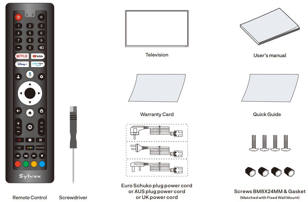 TV, fjärrkontroll, strömkabel samt dokumentation för installation och användning.