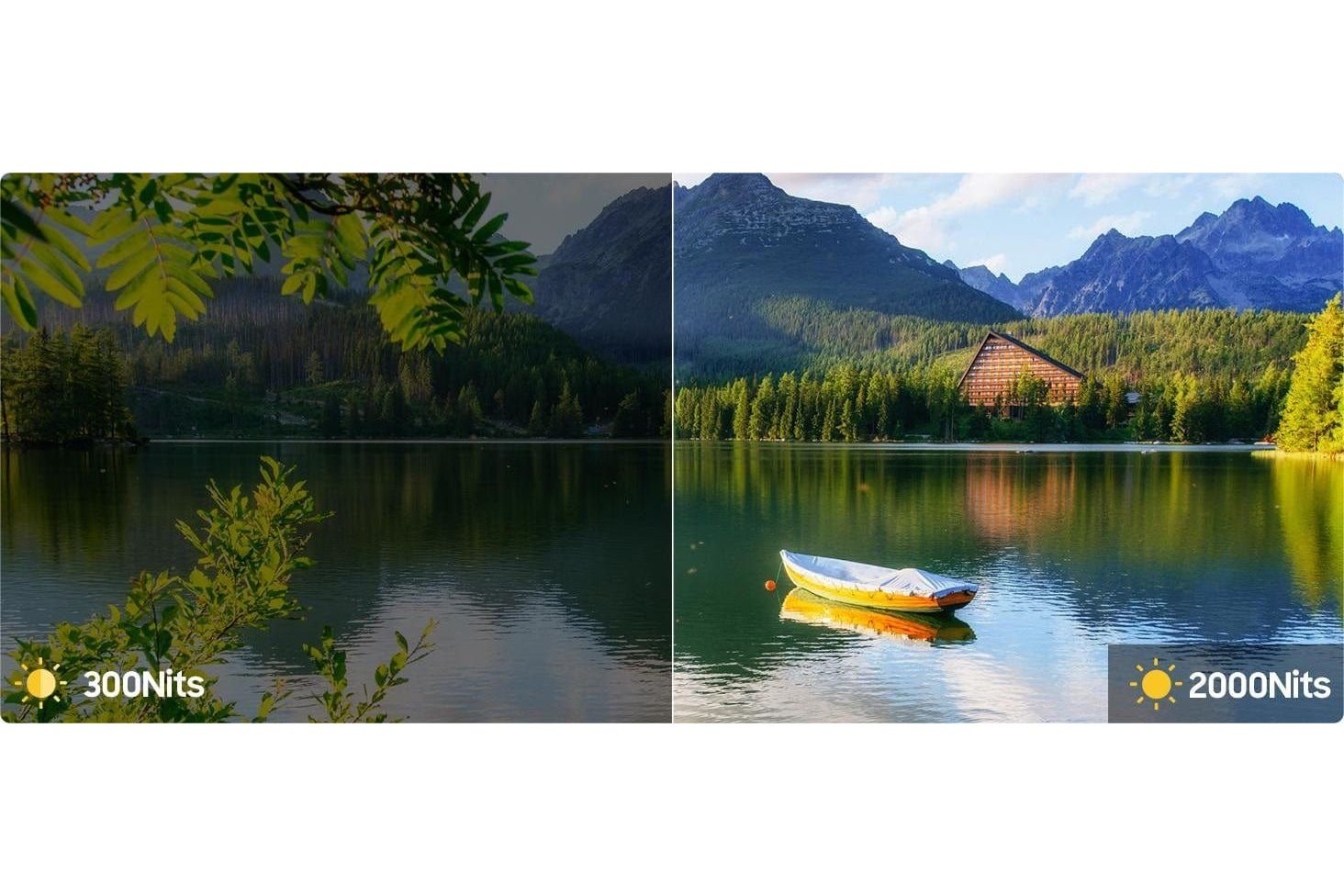 Fungerar TV:n verkligen i direkt solljus?Ja, den höga ljusstyrkan på upp till 2000 nits tillsammans med antireflexpanel gör den fullt användbar även i starkt solljus.