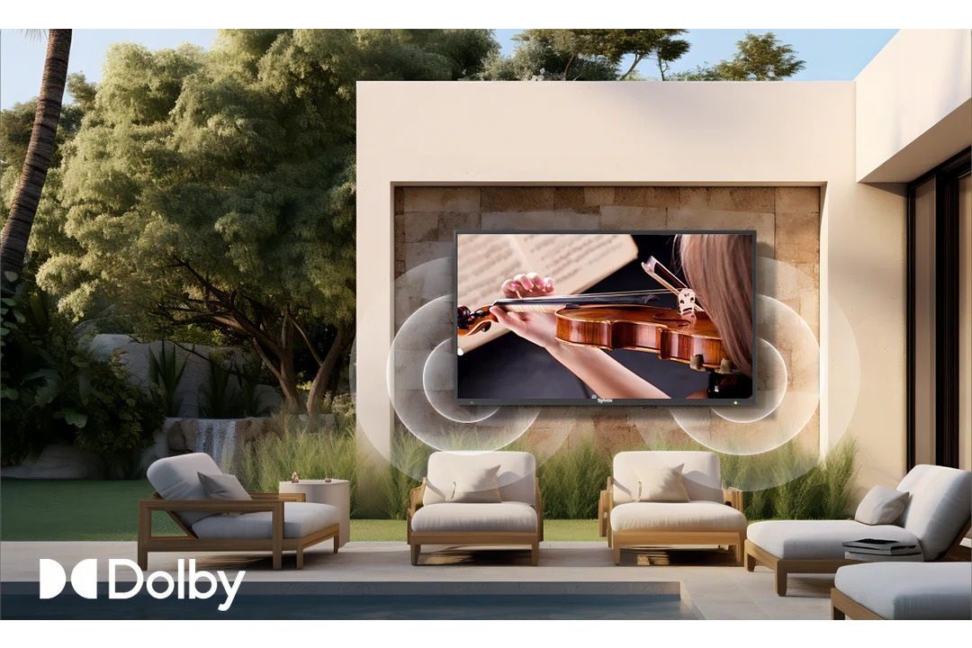 TV:n stödjer Dolby Vision för förbättrad bild med högre kontrast och mer detaljrikedom samt Dolby Atmos för ett mer omslutande ljud – även i öppna utomhusmiljöer.