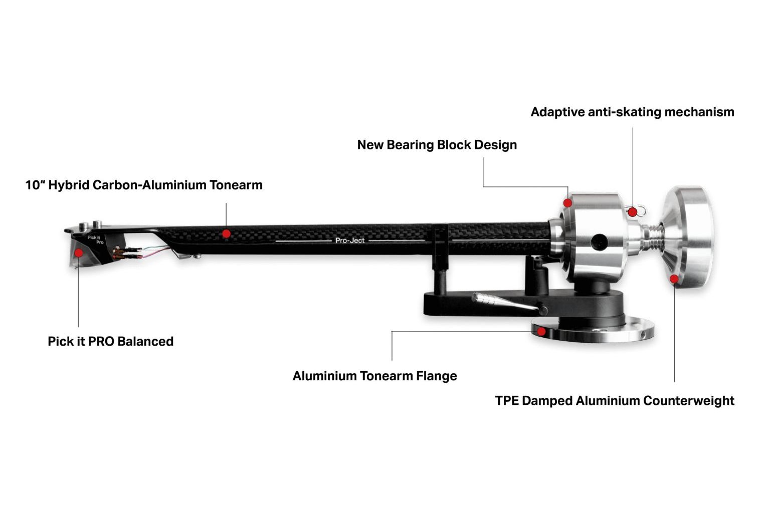Debut Reference 10 är utrustad med en 10-tums tonarm i ett stycke, byggd som en kolfiber–aluminium-sandwich för högpresterande återgivning. Ytterlagret i kolfiber ger utmärkt styvhet och säkerställer att pickupen rör sig exakt. Aluminiumröret inuti dämpar effektivt vibrationer och ger stabil och mjuk drift. Kombinationen av materialen ger en tonarm som både är extremt styv och väl dämpad, vilket resulterar i exakt spårning, minskad distorsion och en renare, mer detaljrik ljudåtergivning