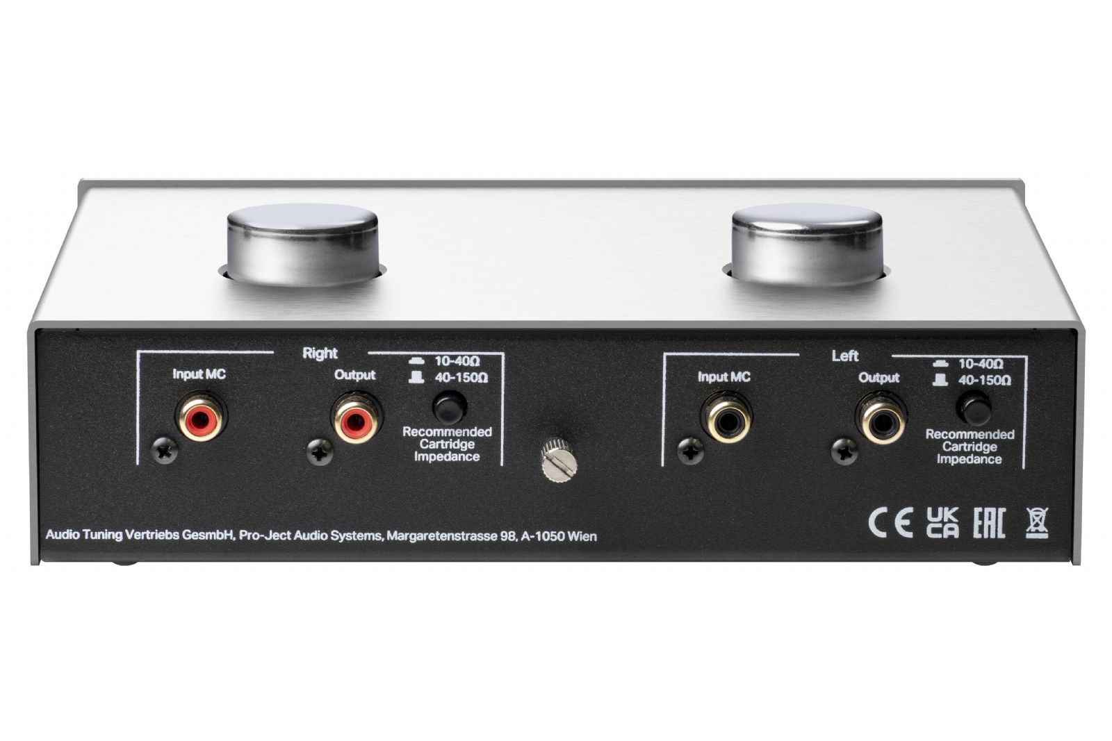 På baksidan finns en knapp för impedansinställning, med två olika lägen (10–40 ohm och 40–150 ohm), vilket gör det enkelt att anpassa transformatorn efter din MC-pickup för optimal ljudkvalitet.