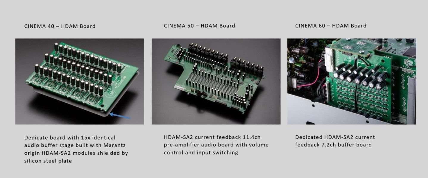 En av de största skillnaderna är att Marantz använder sina egenutvecklade HDAM-moduler (Hyper Dynamic Amplifier Module).